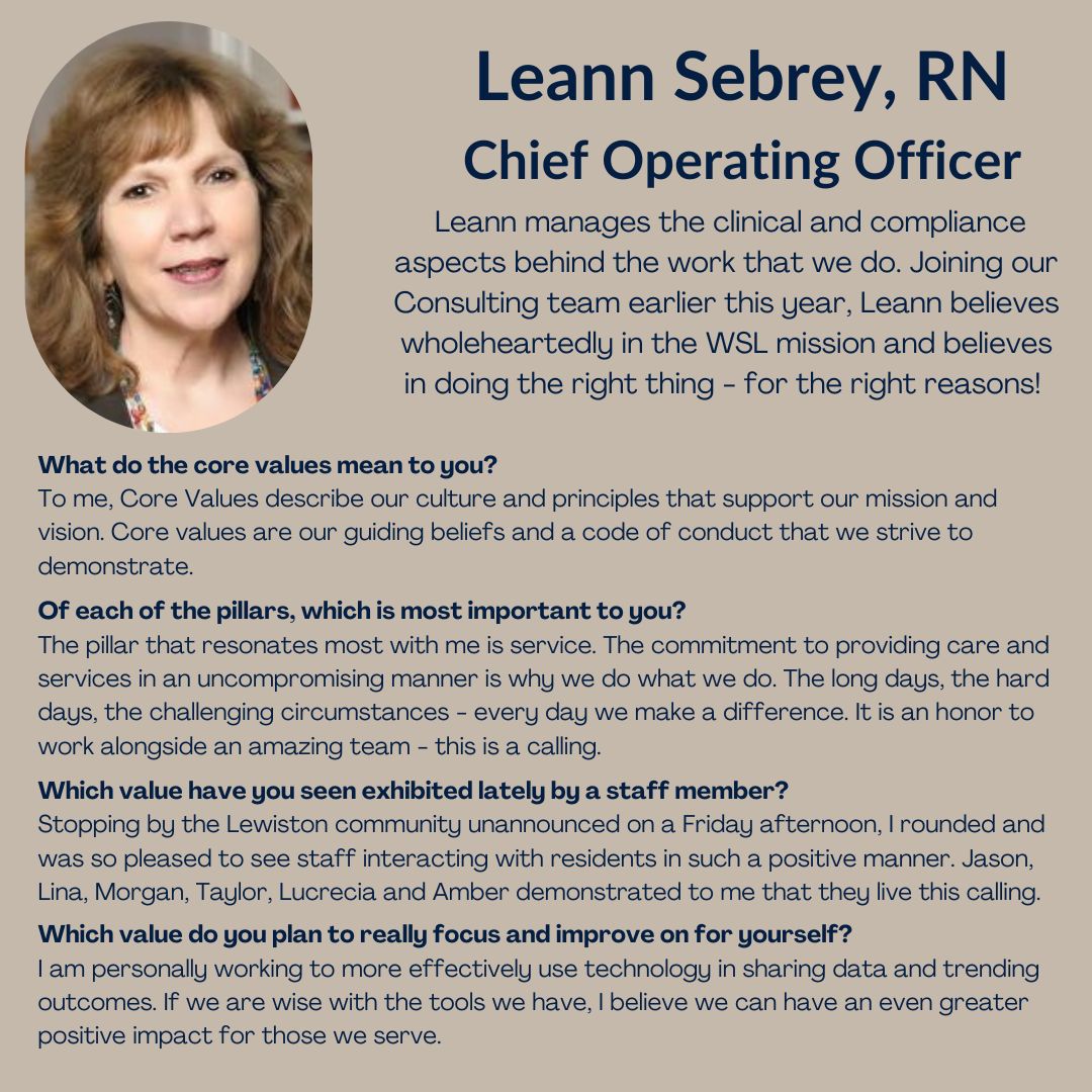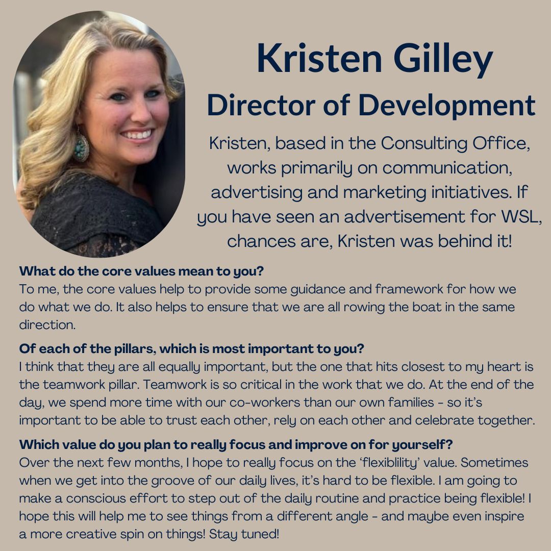 WSL Core Values by Kristen Gilley | Oct 6, 2023 | General News WSL Core Values Kristen Gilley – Core Values Testimonial Shelley Doody – Core Values Testimonial Tammy Niemi – Core Values Testimonial Jeff Hastings – Core Values Testimonial Benjamin Smith – Core Values Testimonial Leann Sebrey, RN – Core Values Testimonial
